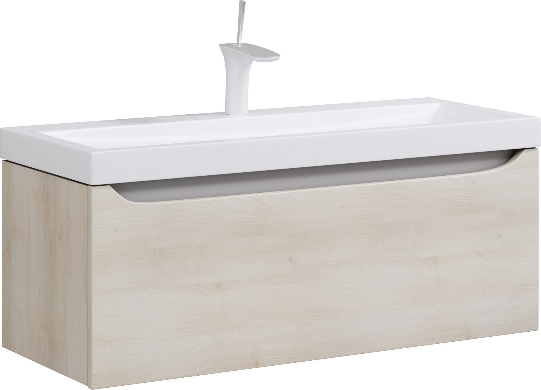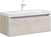 Подвесная тумба в цвете акация с одним выдвижным ящиком и полкой, скрытой за фасадом, с умывальником из литьевого мрамора